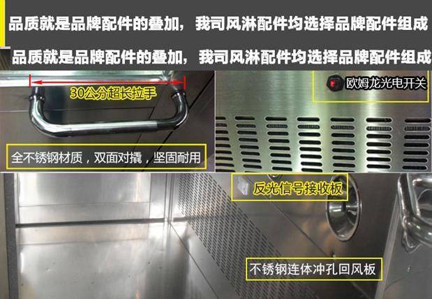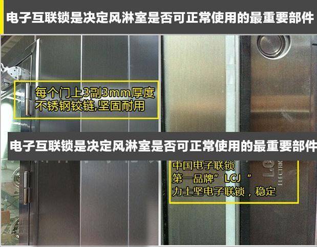 >>風淋室雙門:材質為全不銹鋼,上部帶3C認證鋼化玻璃視窗,下部為不銹鋼平面處理,無凹凸棱角,減少死角;三道3MM厚度不銹鋼鉸鏈,保障門結實耐用,門與門框結合平整、牢固 、美觀,密封性能良好,門開啟靈活。